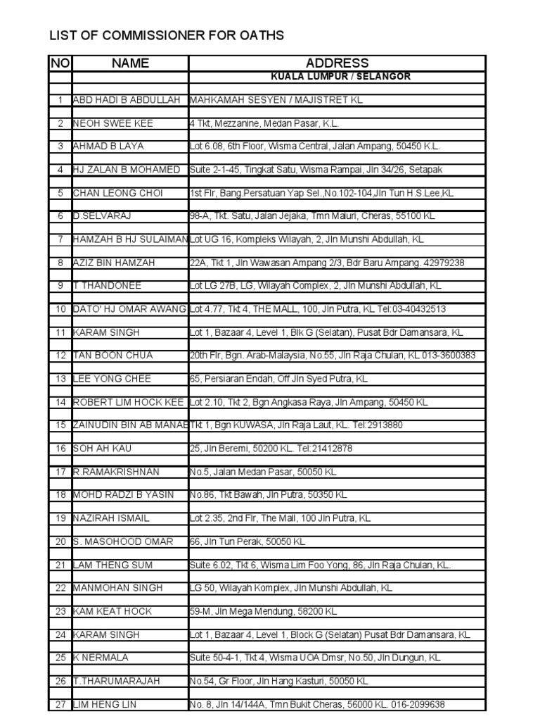 Pesuruhjaya Sumpah Petaling Jaya SS2 Near Ambank Catherine Loh. Rule 11 applies to Commissioners for Oaths who are lawyers. 86 Jalan Putra Kuala Lumpur Wilayah Persekutuan Kuala Lumpur.